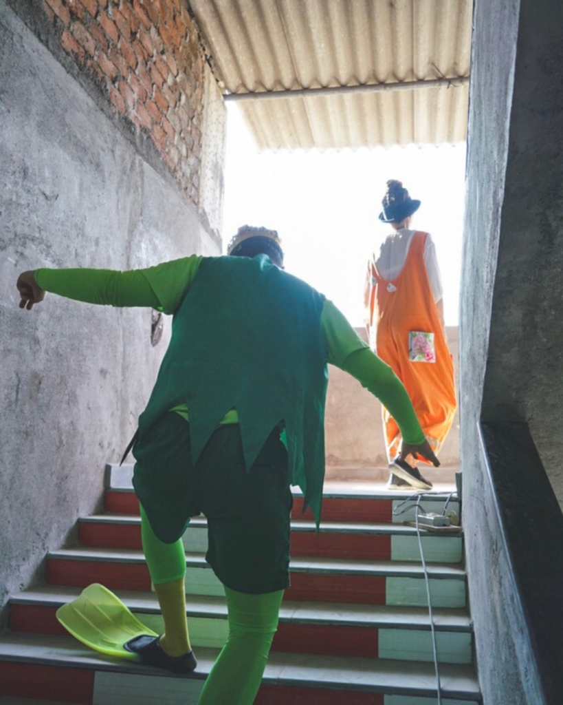 Men den lilla byggnaden med gallerförsedda fönster var inhägnad av metallstängsel med taggtråd högst upp. Vakten som släppte in oss genom den stora porten låste upp två lås. På den lilla gården fanns ingenting annat än en rostig gungbräda. I byggnaden fanns ett allrum, alldeles kalt med betongväggar och stengolv. Ingenting fanns i rummet, förutom ett glasskåp med en bild av guden Shiva, som skapar hela universum med sin dans. I anslutning till allrummet två små sovrum med våningssängar för de totalt åtta pojkarna som bodde där. Förutom det ett litet kök, och ett litet personalrum där vi clowner fick byta om.